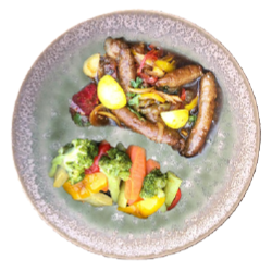 Sausage. Pomegranate Molasses, Souleed Vegetables, Rice